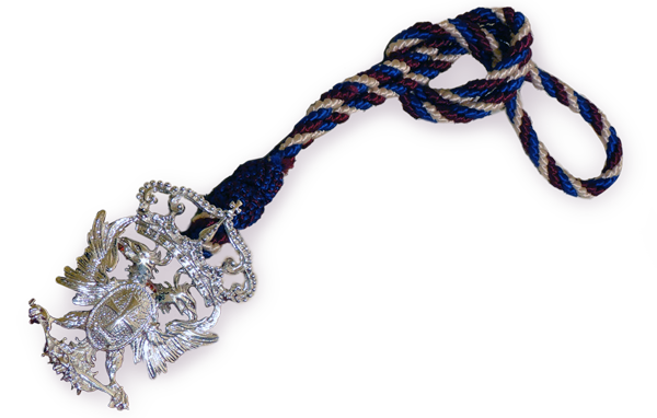 La medalla representa el escudo de nuestra Hermandad. Será plateada e irá colgada de un cordón de seda, alternando los colores rojo, azul y blanco roto.
