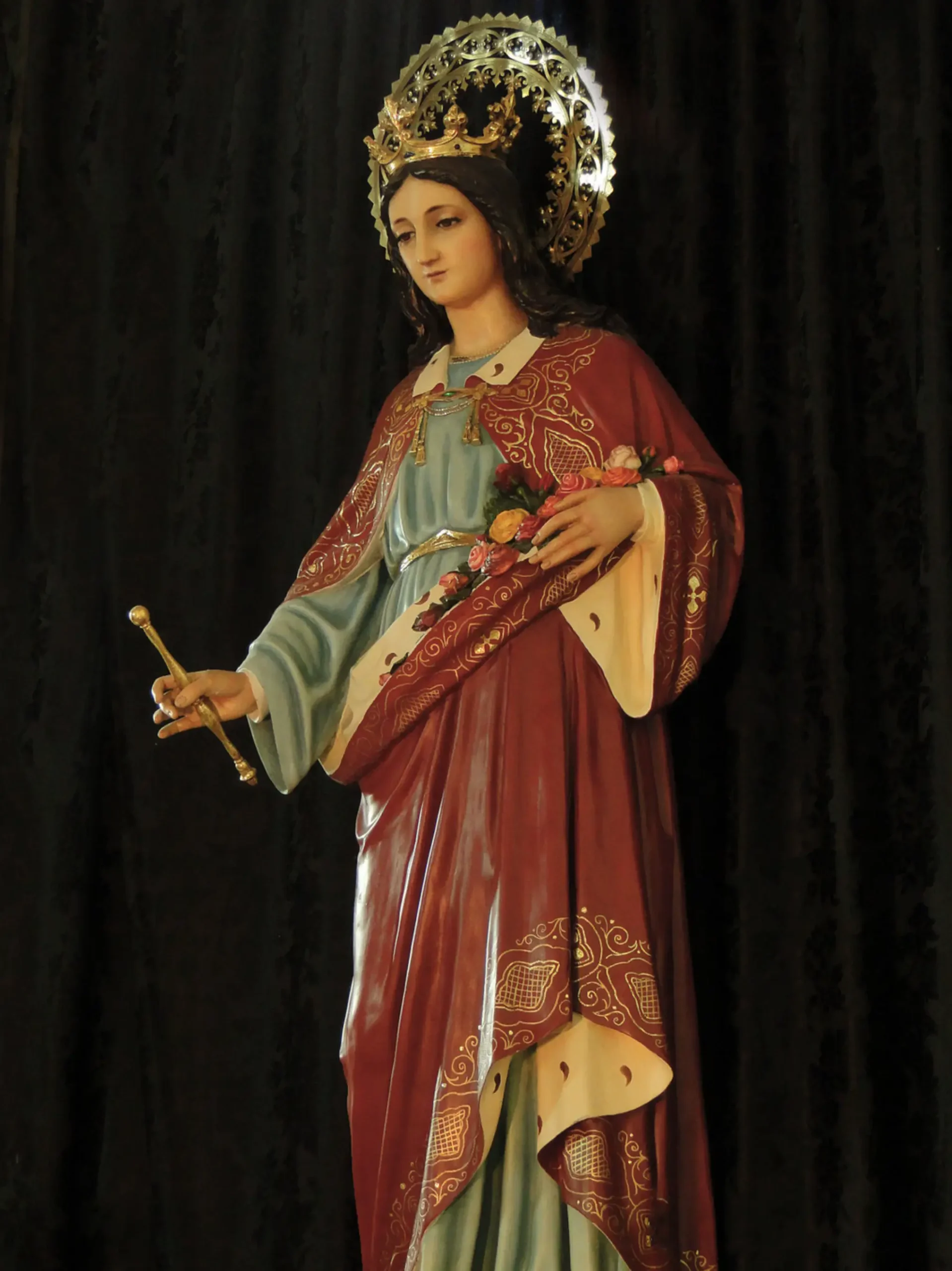 La Santa es representada con un ramo de flores sobre su manto, alegoría de uno de los milagros que realizó durante su vida y con una corona y cetro, por su condición de reina de los portugueses.