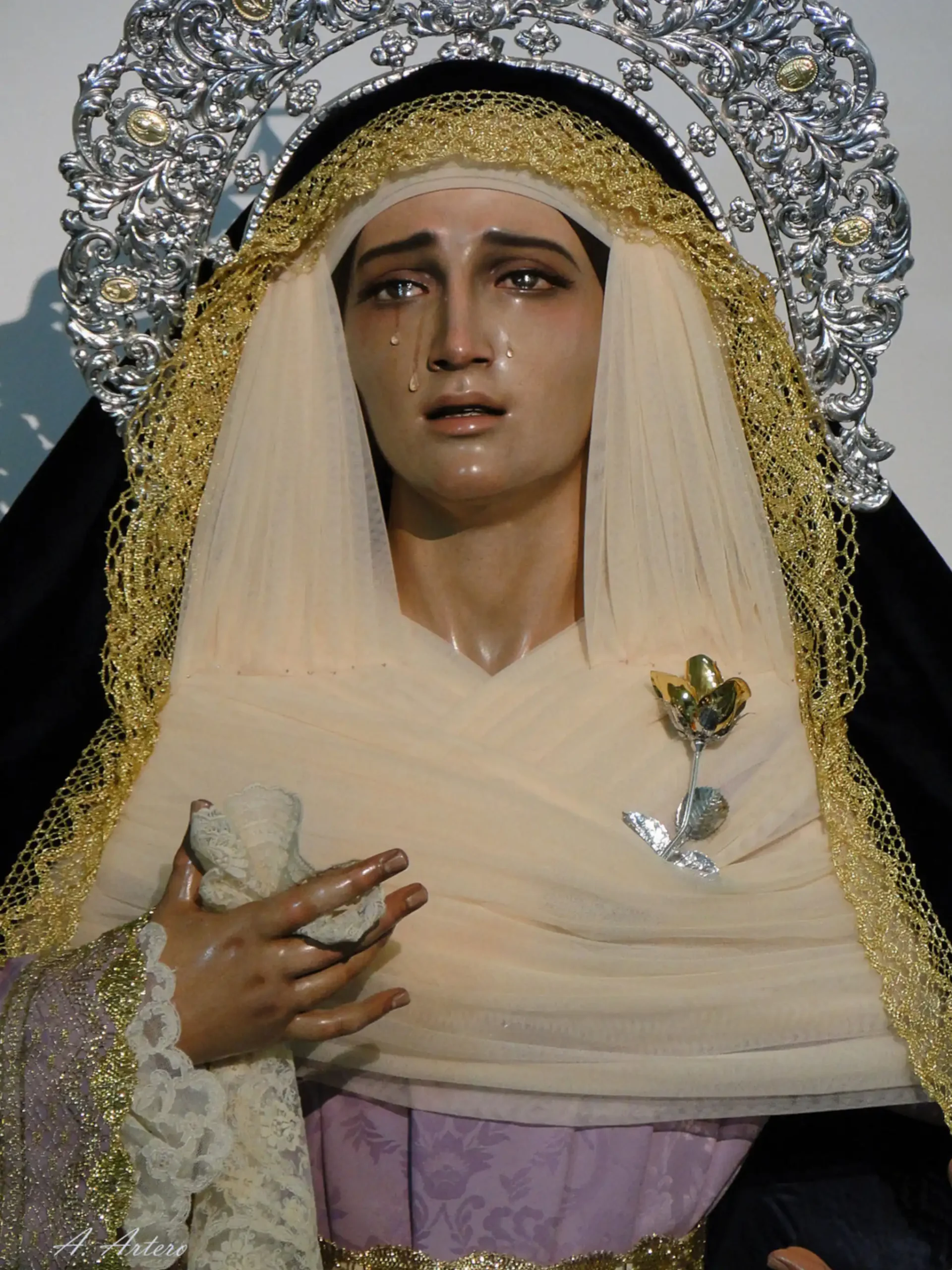 Tres lágrimas surcan sus mejillas, dos en la derecha y una en la izquierda, siendo una alegoría de su advocación, vinculada a la espiritualidad de la Orden Trinitaria.